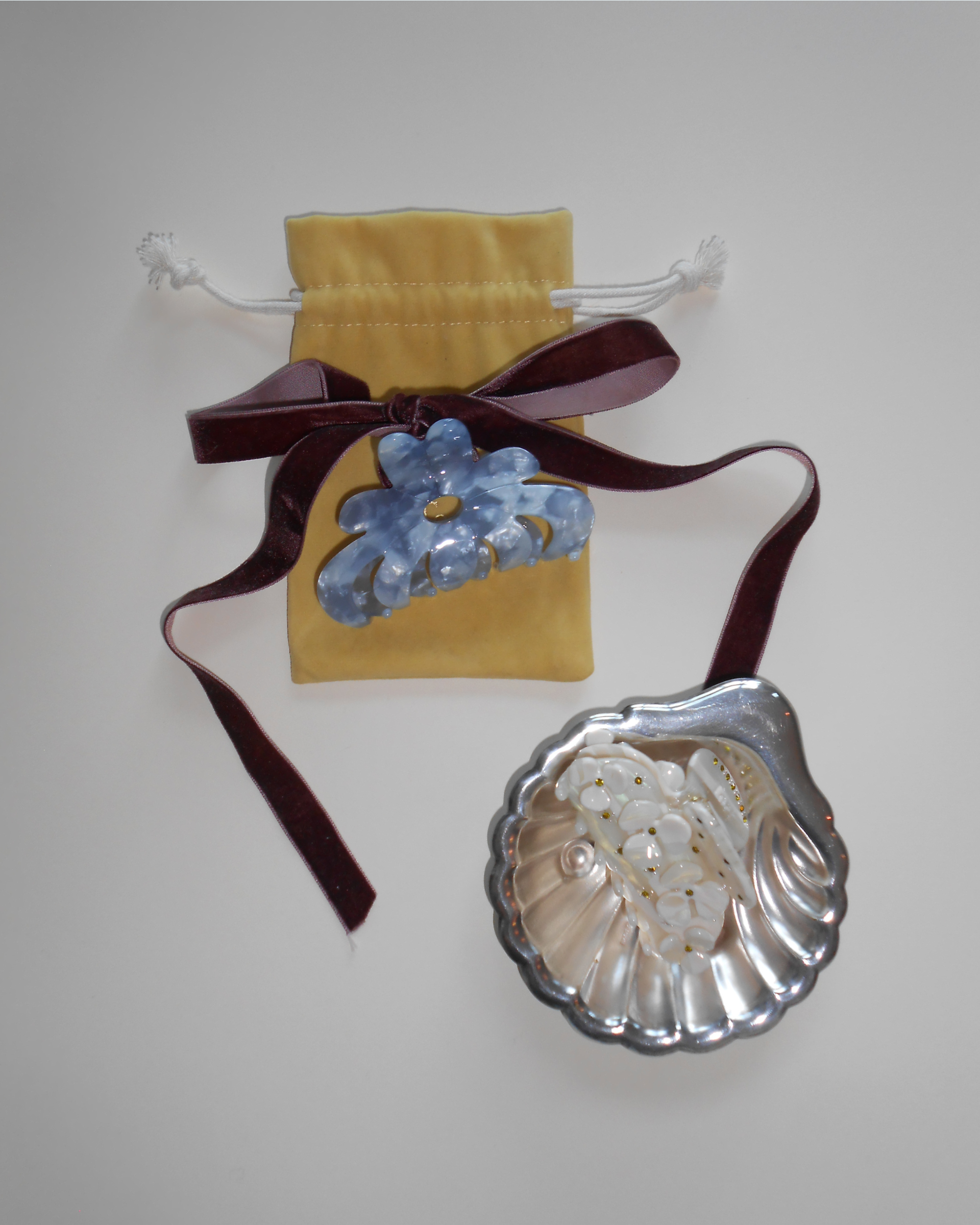 All of our accessories (excluding the metal parts) are made from an eco-resin, which is made from renewable raw materials obtained from wood and cotton. The hand-poured resin means all clip patterns are unique.