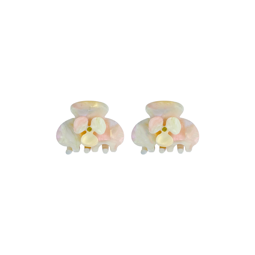 A pair of mini claw clips with a signature flower and jewel accent. Designed for little ones, but totally acceptable (and expected) to wear as grown adults!