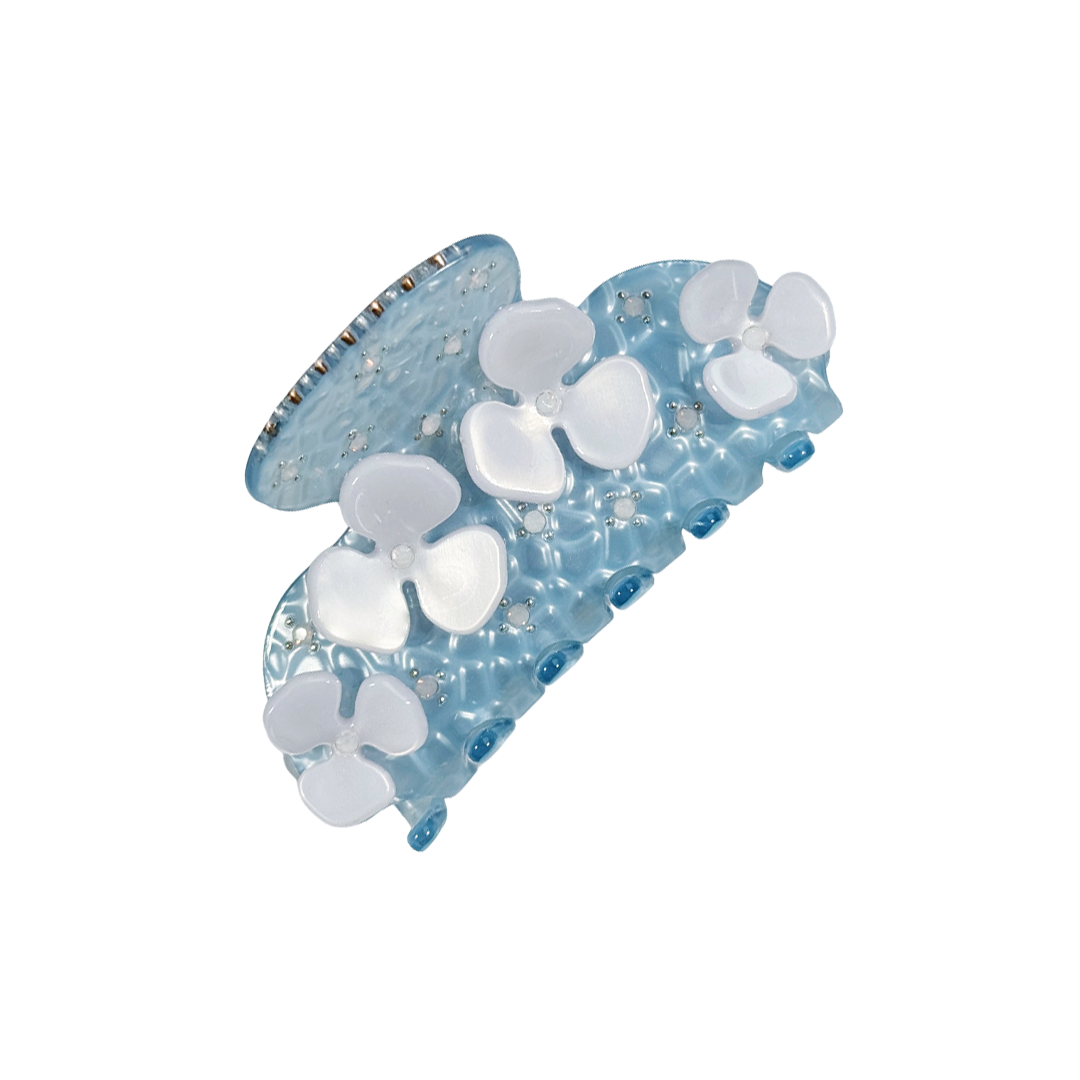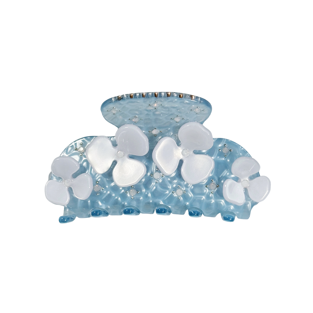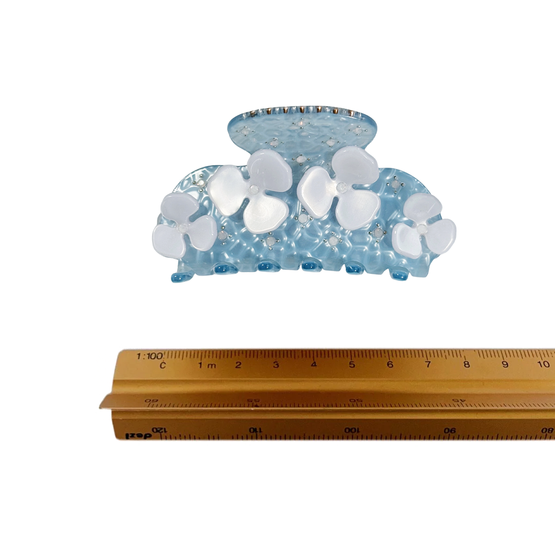A medium sized silhouette claw with flower and rhinestone details. The medium size makes it very easy to use and perfect for an all up look or securing a bun. For shorter hair it can be used for an all up look. It looks as cute off as on the hair.