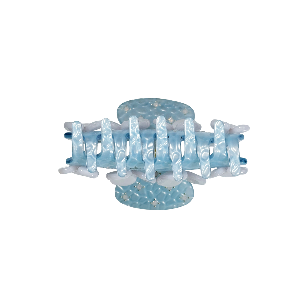 Colour: an iced blue snake print resin base with metallic white floral accents, white opal rhinestones and silver studs.